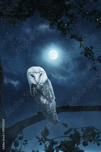 © Brilliant Eye, Obraz premium Stojąca na drzewie sowa jest oświetlona światłem księżyca