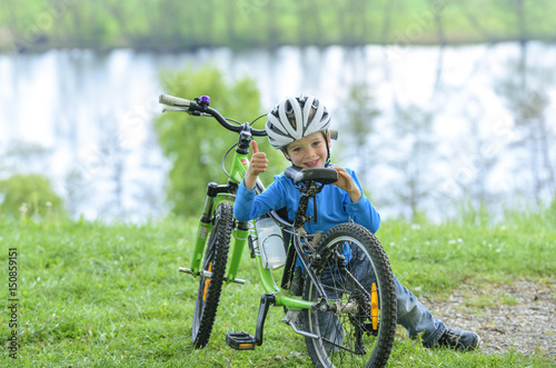 Fototapeta premium stolzer junger Biker mit seinem Rad in der Natur