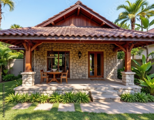 Fototapeta premium stone and wood combined in a tropical villa with shaded veranda tiled roof and surrounding garden soft natural lighting