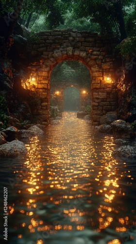 © Inkreatif, Obraz premium Stone Arch Bridge, Lantern Lit Path, Water Reflections, Night Scene