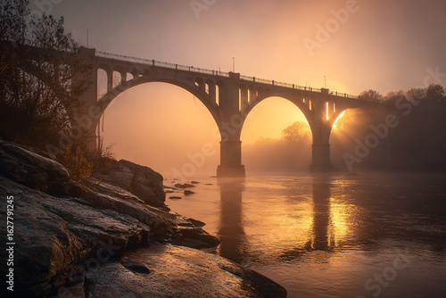 Fototapeta premium Stone arch bridge over a misty river at dawn, warm golden light filtering...