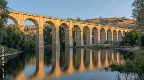 Fototapeta premium Stone arch bridge over calm river, serene reflection