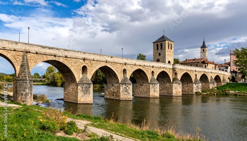 © Nunung, Naklejka premium Stone arch bridge over river, town in background