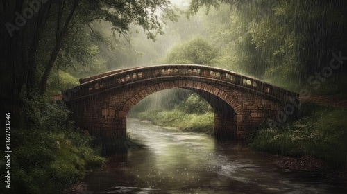 © Ibnu, Fototapeta premium Stone arch bridge over stream, rain-soaked forest.