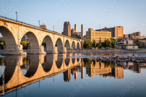 Fototapeta premium Stone arch bridge reflecting in calm river water at sunrise, city skyline in...