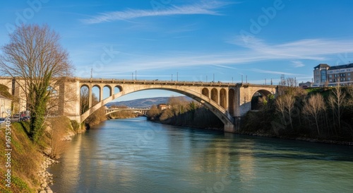 © efa, Naklejka premium Stone arch bridge spanning a river under a clear sky