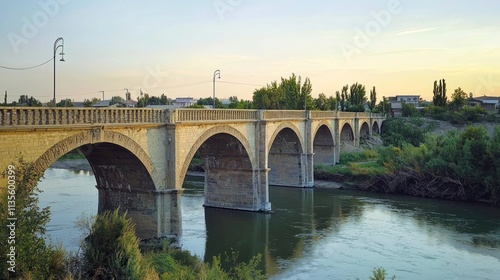 © Nuriya, Fototapeta premium Stone Arch Bridge Spanning River at Sunset