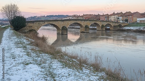 © M_H_L, Fototapeta premium Stone Arch Bridge Spanning River in Winter Sunset