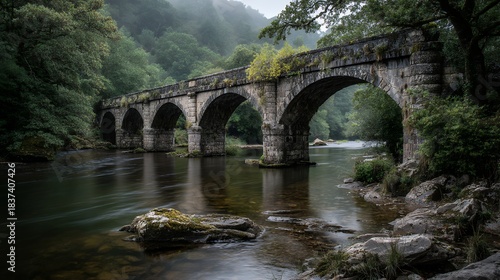 Fototapeta premium stone arch bridge spans a river in a green landscape