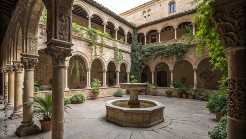 Fototapeta premium Stone arches and columns enclose a serene courtyard garden, featuring a central fountain, potted plants, and creeping vines, creating a peaceful atmosphere