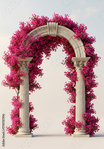 Naklejka premium Stone Archway Covered in Vibrant Pink Bougainvillea Flowers classical columns...