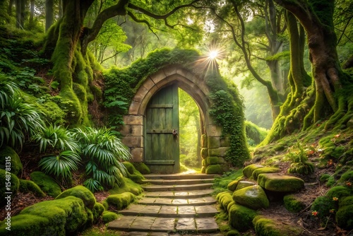 © Jesmin, Fototapeta premium Stone archway gate opens to sunlit mossy forest path, mystical scene