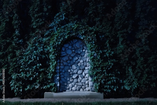 Obraz premium Stone archway in lush green hedge illuminated at night time