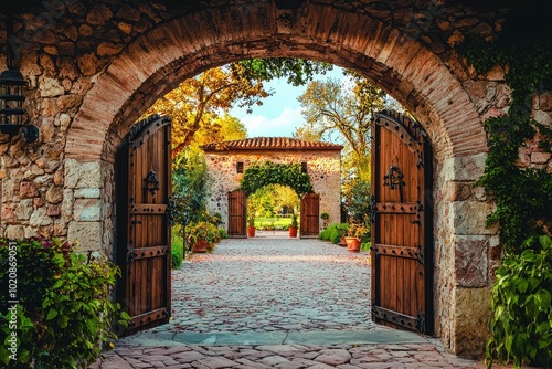 Fototapeta premium Stone Archway Leading to Courtyard with Wooden Doors
