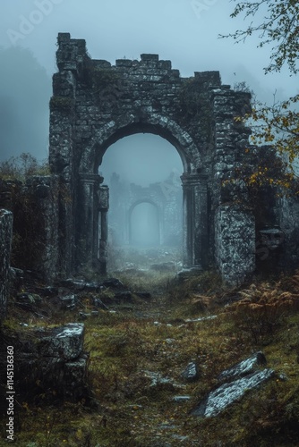 Obraz premium Stone archway ruins, overgrown, foggy landscape.
