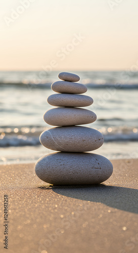 Fototapeta premium Stone Balance on Beach: Zen Stack by the Sea, Peaceful Coastal Art