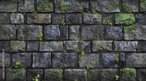 © Aisha, Fototapeta premium Stone brick wall with visible mortar and moss resting on it