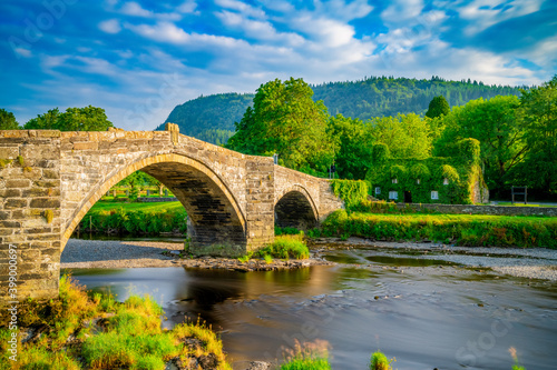 Fototapeta premium Stone bridge and old cottage covered with vine leaves, Llanrwst, Caernarfon,...