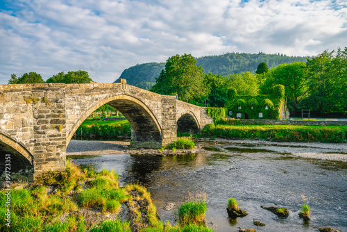 Fototapeta premium Stone bridge and old cottage covered with vine leaves, Llanrwst, Caernarfon, North Wales