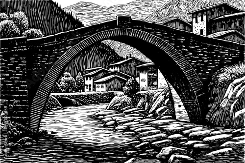 Fototapeta premium Stone bridge crossing a shallow river in a mountain village, a black and white sketch vector hand drawn