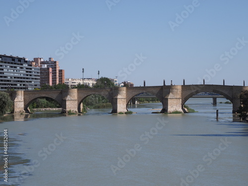 Fototapeta premium Stone bridge of lions and Ebro river in Saragossa city in Spain