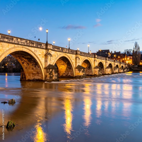 Obraz premium Stone bridge over calm river at twilight