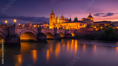 Fototapeta premium Stone Bridge Over River at Sunset with Church in Background, water, dusk,...