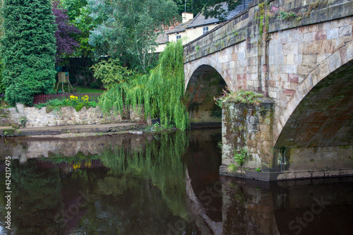Fototapeta premium Stone Bridge over river with green plants