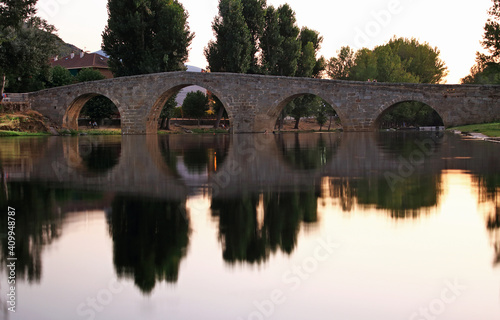 © Nacho, Fototapeta premium Stone bridge, river with ducks and reflection