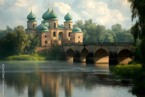 © sarinya, Fototapeta premium Stone Bridge with Ancient Cathedral and River Reflection
