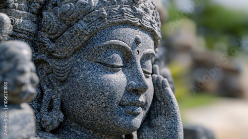 Fototapeta premium Stone Buddha Statue Close up Serene Face Meditation Asian Art Spirituality