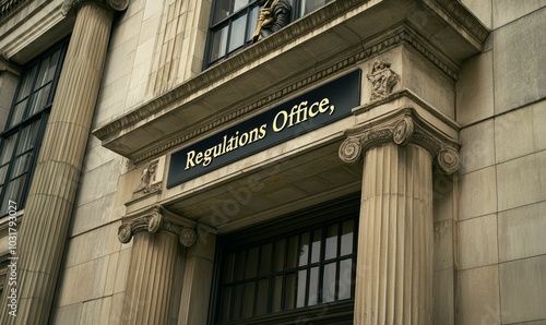 Fototapeta premium Stone building with a "Regulations Office" sign.