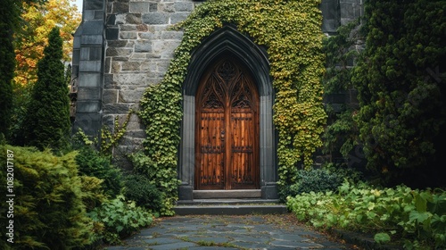 © Rere_Art151, Fototapeta premium Stone Building with Ivy-Covered Archway and Wooden Door