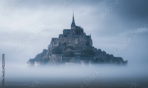 Naklejka premium Stone castle, foggy island, tranquil sea.