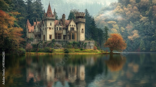 © Ali, Fototapeta premium Stone castle on a lake surrounded by trees.