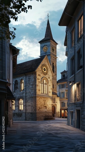 © KOOLAIDMAN100X, Naklejka premium Stone church at twilight, city scene
