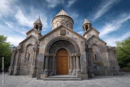 © Dzikrul Husnani, Obraz premium Stone Church: Majestic Armenian Architecture under a Blue Sky