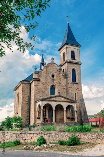 © Todayphoto, Naklejka premium Stone church through green branches of trees. Goslings graze near the church.