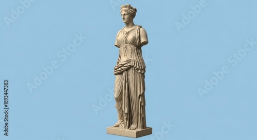 © Farzana, Fototapeta premium Stone classical Greek goddess statue on plinth against clear sky, copy space for poster or website banner