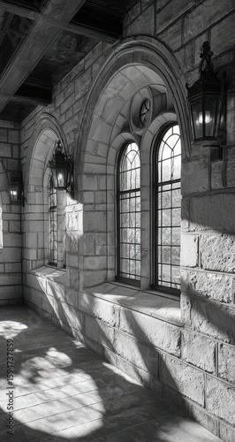 Obraz premium Stone corridor with arched windows and shadows.