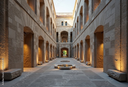 © magann, Obraz premium Stone Courtyard with Arched Alcoves and Water Feature