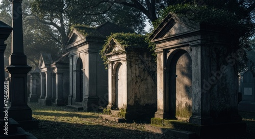 Naklejka premium Stone crypts in an old cemetery with overgrown vegetation, bathed in morning...