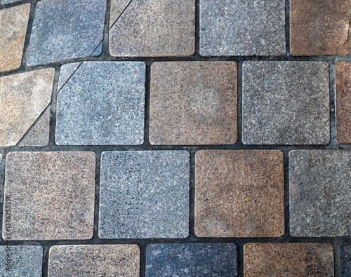 © ttrimmer, Obraz premium Stone Cube Roadway with Pastel Blue and Red Faded Tiles.
