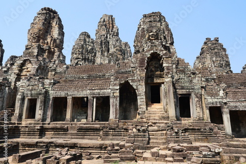 © anant_kaset, Naklejka premium Stone faces of God at Bayon Temple in Angkor Thom, One of the main attractions, Sculpture carved in ancient times with Hindu belief with blue sky in background at Siem Reap , Cambodia