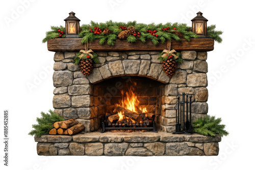 © PNG Kingdom , Fototapeta premium Stone fireplace with roaring fire, decorated for holidays, featuring garlands, lanterns, and pinecones, isolated with transparent background