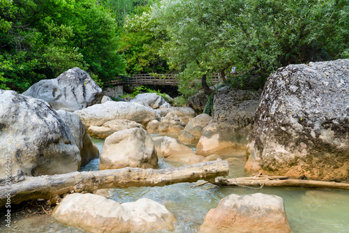 © Bilal, Naklejka premium Stone formation near Ilica waterfalls and wooden bridge in background, Pinarbasi, Kastamonu/Turkey