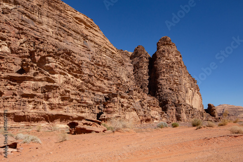 Fototapeta premium Stone formations in Wadi Rum desert. Sunny day in Wadi Rum, Jordan