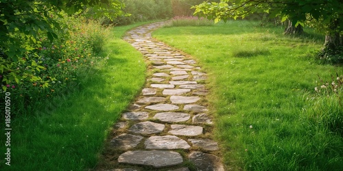 Fototapeta premium Stone garden pathway with natural surroundings, ideal for outdoor relaxation...