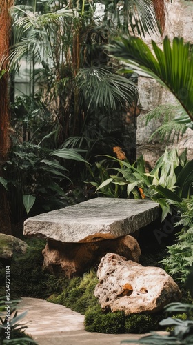 Obraz premium Stone garden table surrounded by plants and decorative rocks in a serene...