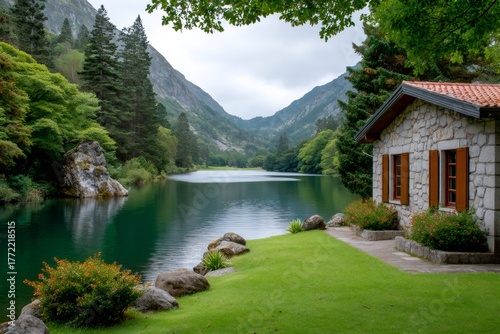© kardaska, Naklejka premium Stone house sitting by tranquil lake in mountain valley